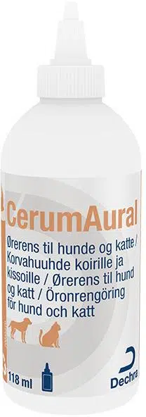 CerumAural on tehokkaasti korvavahaa liuottava korvahuuhde kissoille ja koirille.